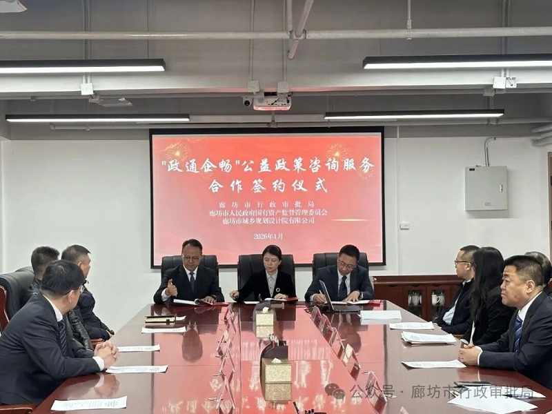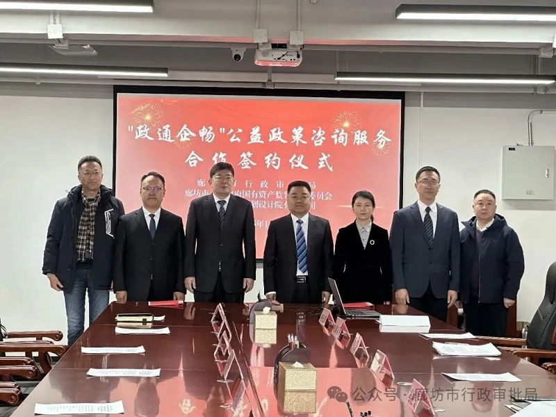 1月16日上午,廊坊市行政审批局、市人民政府国有资产监督管理委员会、市城乡规划设计院有限公司在市行政审批局举行“政通企畅”公益政策咨询服务合作签约仪式。三方主要领导共同出席,企业代表应邀见证,标志着我局政策咨询服务实现全新升级,进一步赋能企业成长。